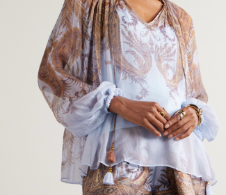 Платье миди из воздушного шелка с абстрактным принтом, вороником стойка с летами, многоуровневой юбкой и отделкой с оборками и объёмные рукава.Состав:..